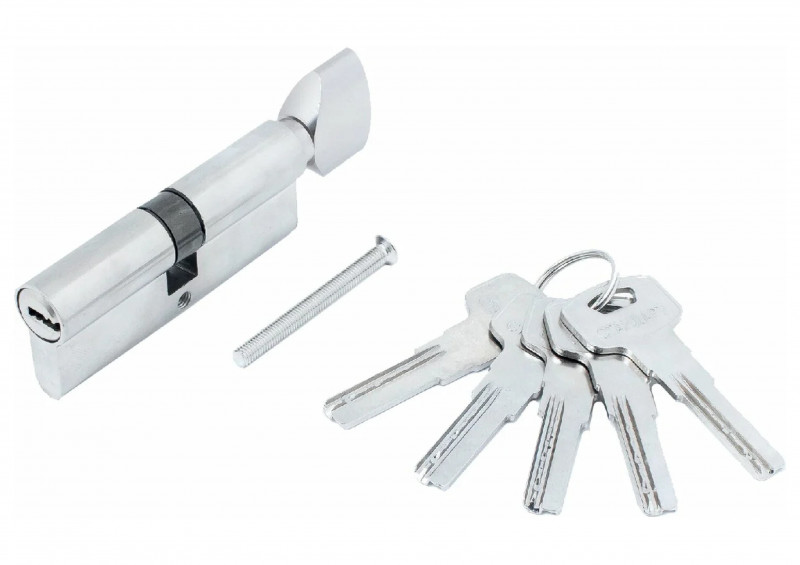 Цилиндровый механизм Стандарт устанавливается вместе с врезным замком. Запирание осуществляется с помощью английского ключа, который идет в комплекте в количестве 5 штук. Кулачок механизма выдвинут на 30 градусов от плоскости, что препятствует выбиванию цилиндра из двери.