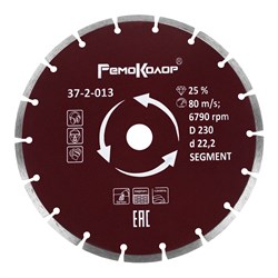 Описание: Диск алмазный РемоКолор SEGMENT 230х22,2 мм 37-2-013 - алмазный диск для широкого спектра действия. Подходит для выполнения непродолжительных бытовых работ. Предназначен для резки кирпича, бетона, натурального и искусственного камня. Способен разрезать тонкую арматуру в бетоне. 25% алмазной крошки в составе связки. Высота сегмента - 7 мм. Посадка 22,2 мм. Переходное кольцо в комплекте. Сухой рез. Охлаждение водой увеличивает ресурс диска.