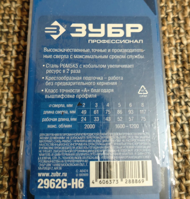 Набор сверл по металлу класс А 2-8мм 6шт ЗУБР КОБАЛЬТ